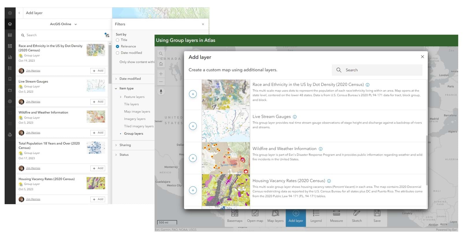 Just like with other layer types, Map Viewer allows you to add these to your maps in a variety of ways. You can add the Group layers through the item details page and via the item browser. And the new Atlas app will also support Group layers in its Add content workflows.