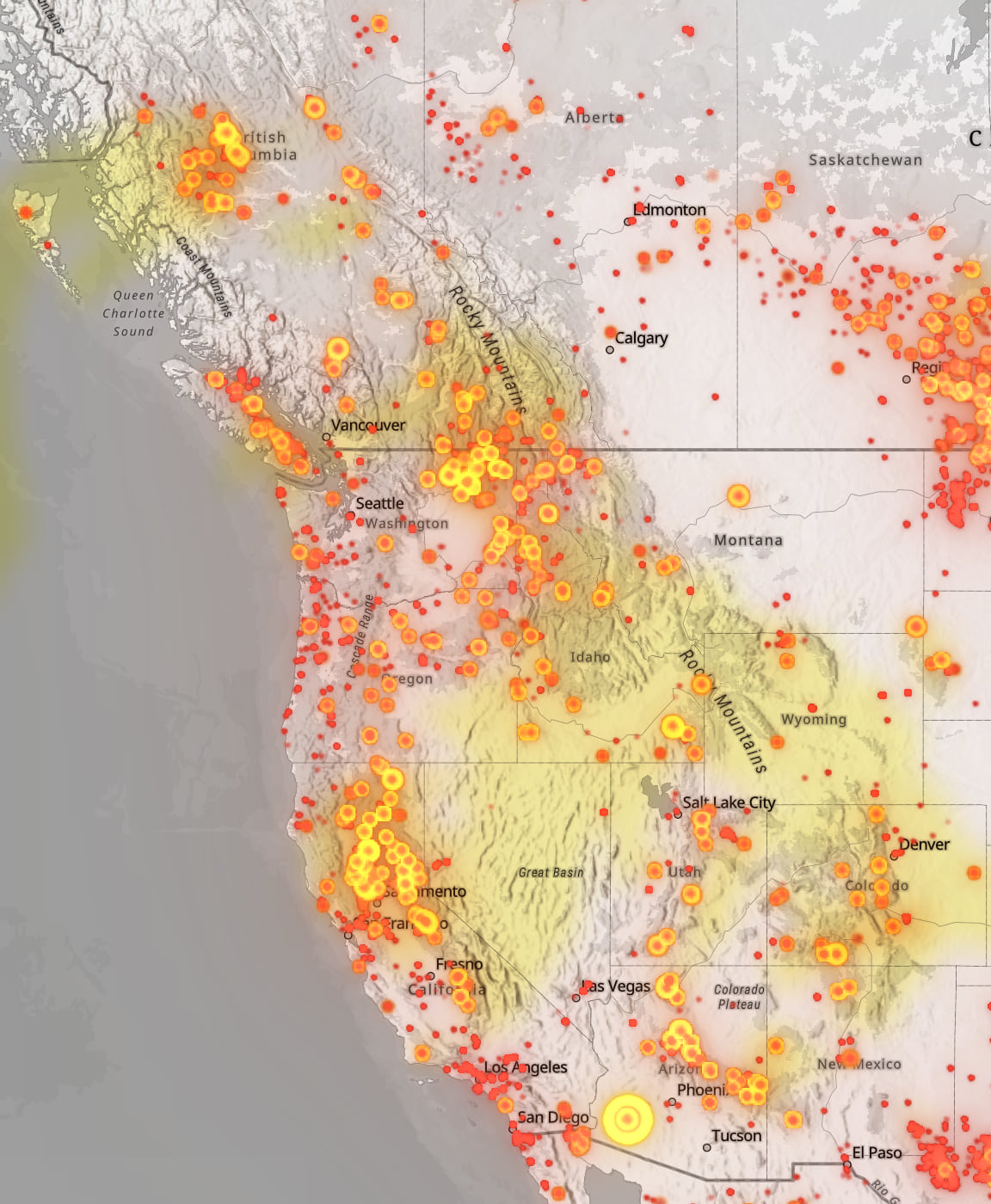 Esri offers many interesting live data streams, including satellite monitoring of wildfires, as seen in the map below. When combined with data from real-time smoke and haze monitoring, the combination of these two datastreams offers a great look at how the places often most impacted by smoke can be hundreds or even thousands of miles downwind from the fires themselves.