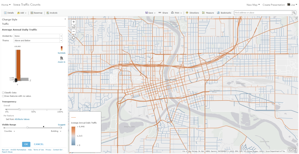For example, if the city of Des Moines wants to know which roads have above-average daily traffic, they could use the Above and Below theme to easily highlight the pattern. When using this technique, smart mapping provides color ramps that diverge into two different colors, where the value you choose to center your map will be the point at which the colors split. In this map, we can easily see that the brown streets have daily traffic levels that are above average, while blue streets are below-average.