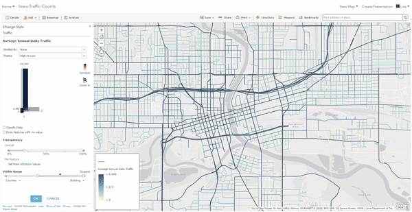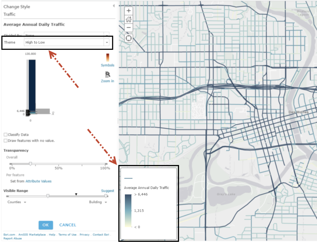 Smart mapping will automatically provide you a map using a “High to Low” theme. This is a great way to emphasize the highest and lowest values in your data using a gradient of colors, or two distinct colors (one for the highest and one for the lowest). For example, if the city of Des Moines, IA wants to map the annual average daily traffic on its roads, the default High to Low theme highlights which roads have the most traffic with the darkest color in the ramp.