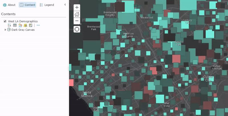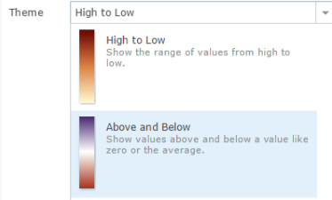 Another way to change the story being told, is to change the theme option to Above and Below. This centers the map around an central value, using color to show which features have values above or below the specified value. By default, smart mapping uses the statistical average of your data, but you can also adjust the center to a value which you know is meaningful to the map subject.