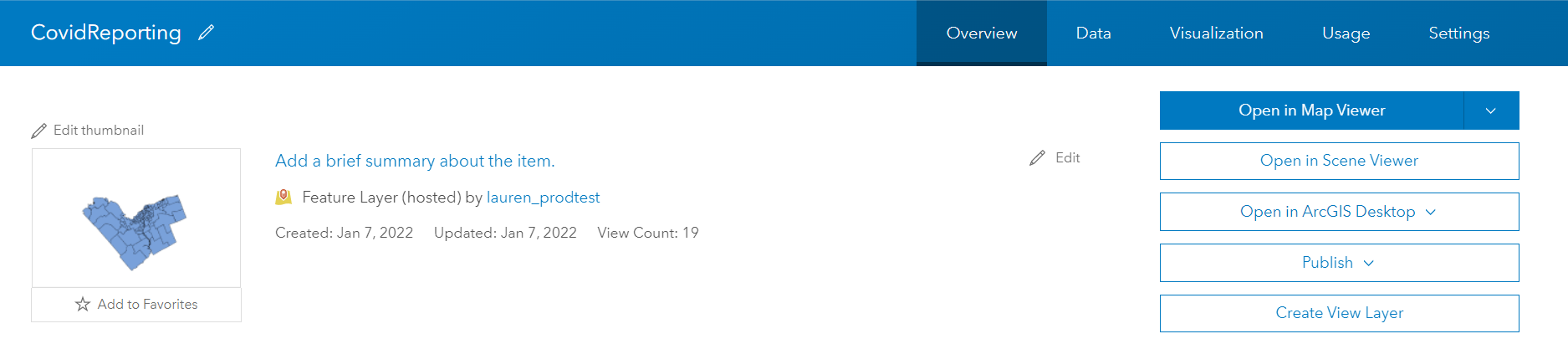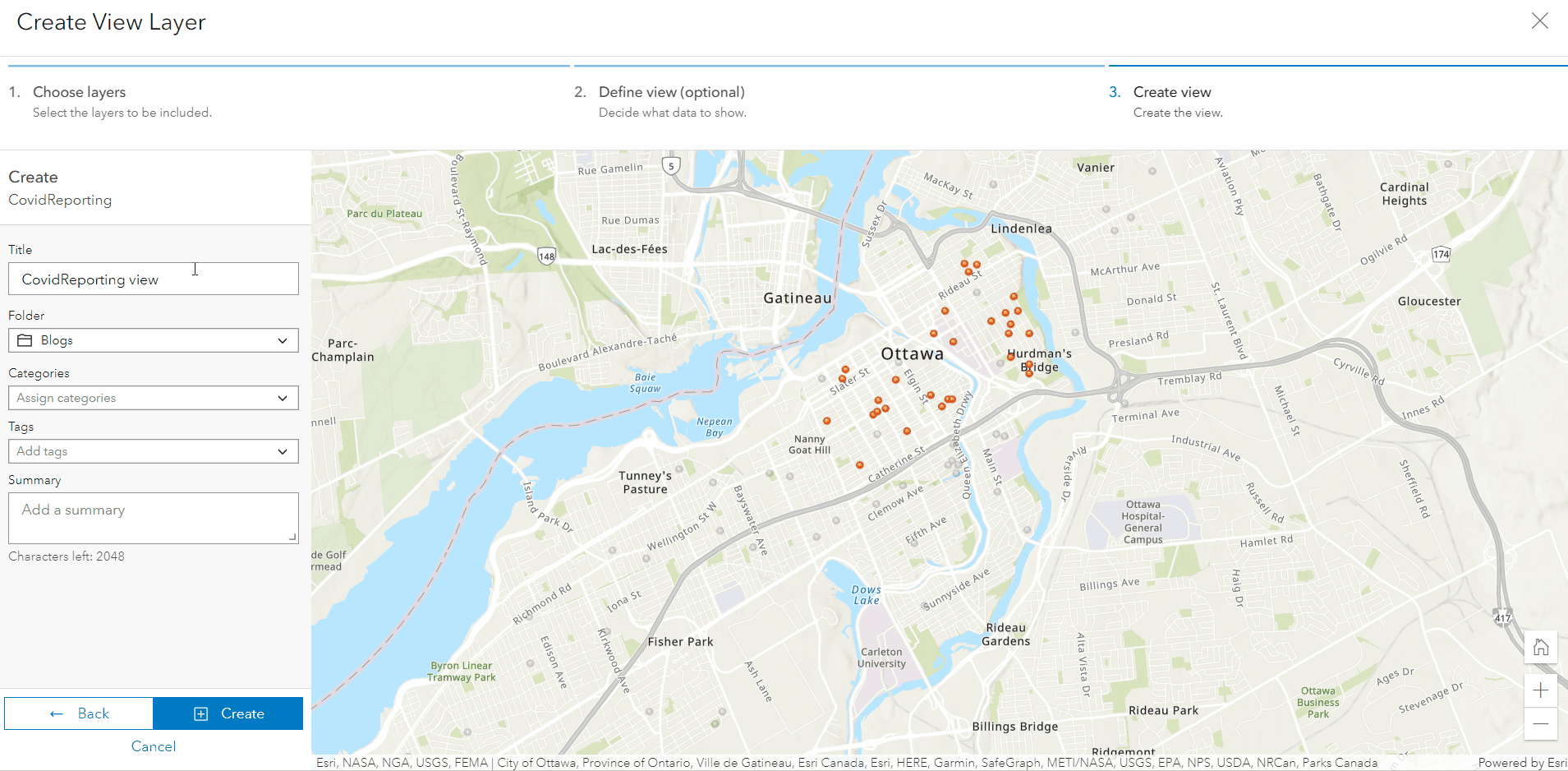 Let’s walk through the new create experience together with an example. Say I have a team of data reviewers responsible for managing Covid-19 infection data for downtown Ottawa. I also have a hosted feature layer comprised of a Covid-19 reporting layer, an Ottawa neighborhoods layer, and a summary table of confirmed cases. Only the Covid-19 reporting layer is relevant to the reviewing process, so I’ll need to create a view layer that only contains the Covid-19 reporting layer and excludes patient information for confidentiality reasons.