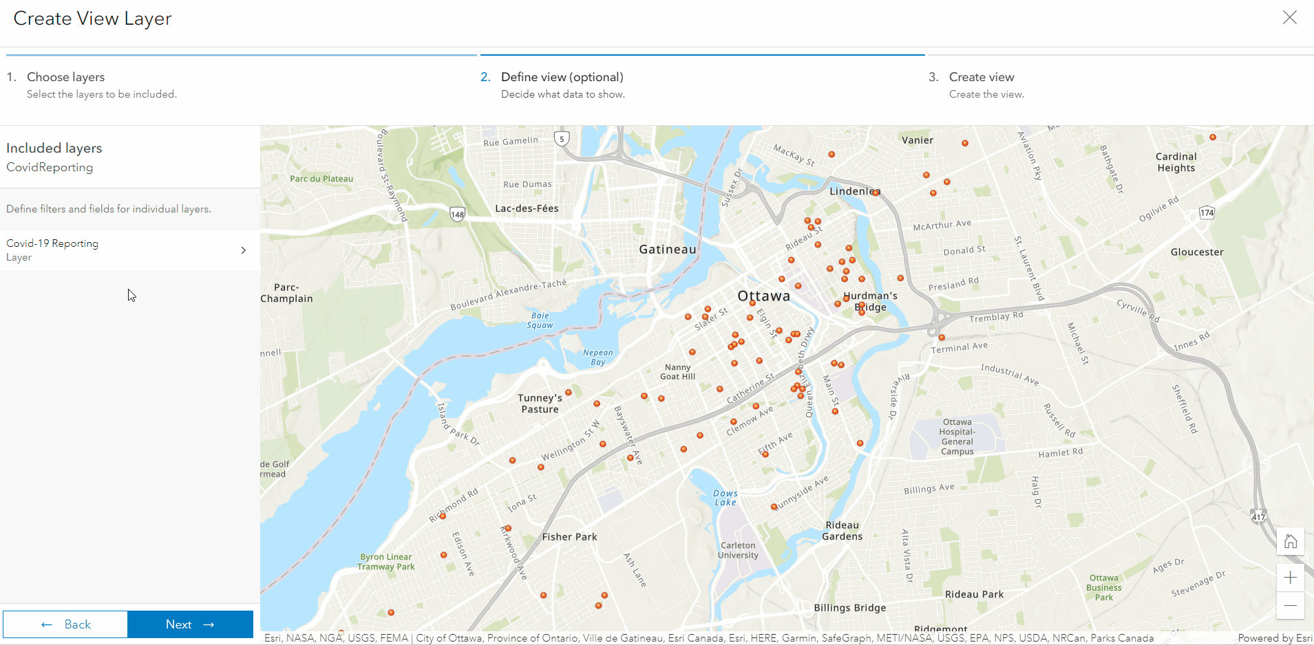 This is an optional step in which you set the view definitions, filter, area of interest, and/or field definition, for each layer and table in the view. For our example, I’ll use a filter to show records that have not been reviewed, an area of interest to focus on downtown Ottawa, and a field definition to exclude patient personal information.