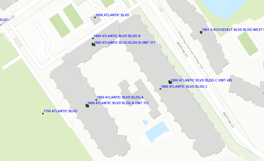 Many building complexes that share a main address have one point for the entire complex accompanied by individual building identifiers. In this example the ‘Northside Dr’ building identifiers aren’t used. Instead, the apartments are numbered consecutively.