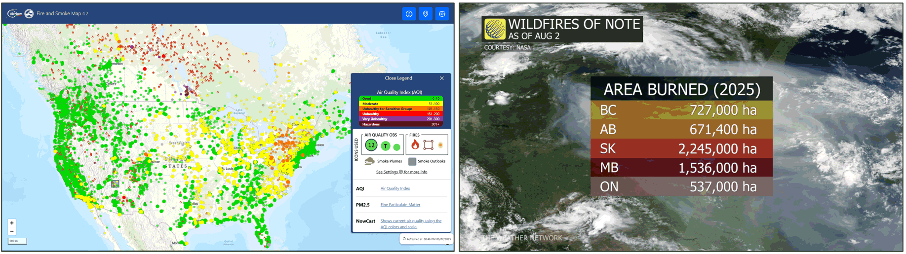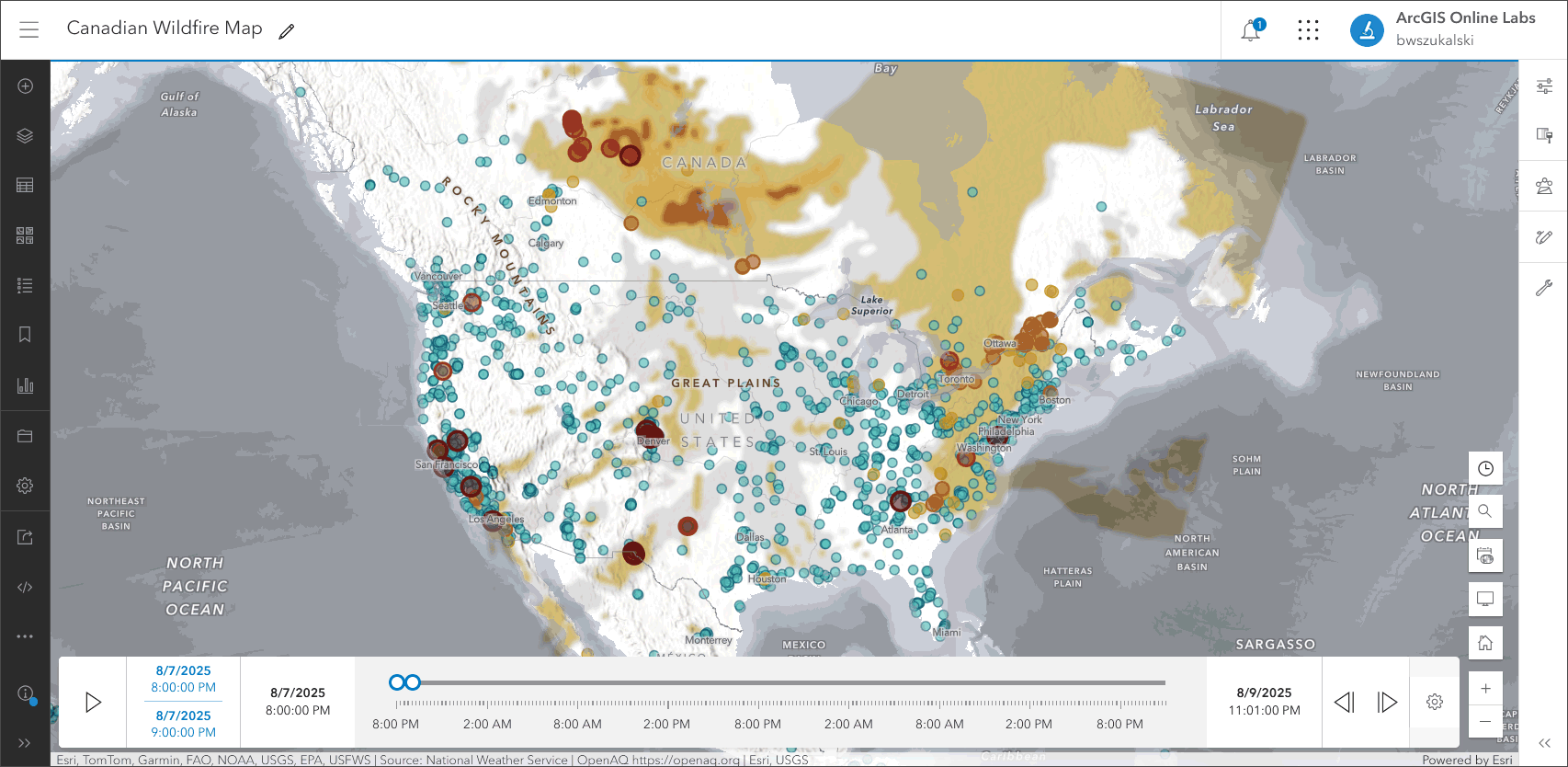 You can view a similar blog article covering smoke and air quality using different Living Atlas content which is also applicable to the current Canadian fires. For more information, see Map in a minute: Map smoke and air quality using ArcGIS Online and ArcGIS Living Atlas.