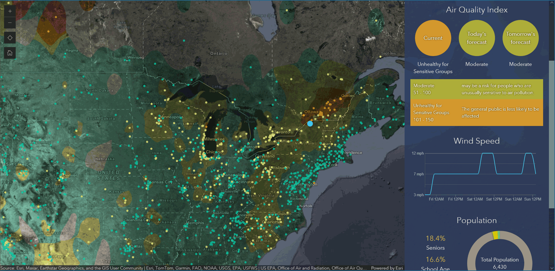 The app includes authoritative Living Atlas content from the EPA’s Air Now program for current and future air quality information, NOAA National Weather Service wind forecasts, and demographic data from the U.S. Census Bureau American Community Survey.