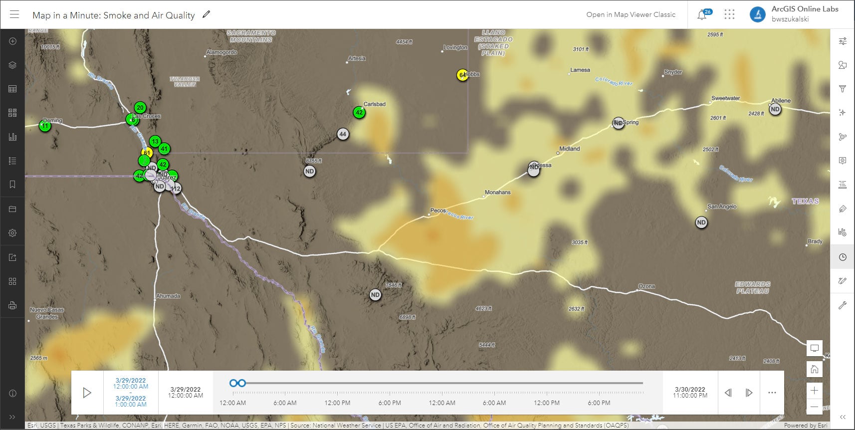 ArcGIS Living Atlas of the World includes authoritative live feeds and other content that helps you learn more about current and predicted smoke conditions and current air quality. Follow these steps to make your own smoke, fire, and air quality map in a minute, maybe less.