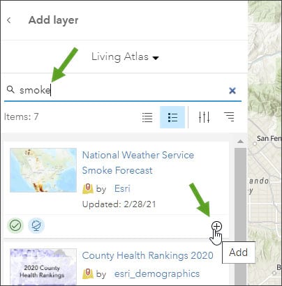 Step 3 — Enter “smoke” in search to locate matching layers from the Living Atlas. Locate the National Weather Service Smoke Forecast layer and click (+) to add it to the map.