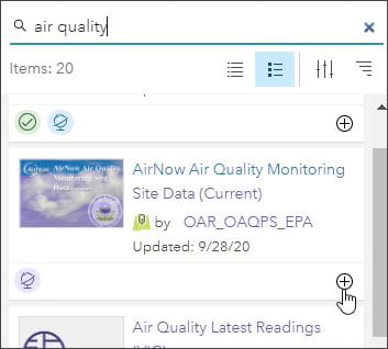 Step 4 — Enter “air quality” in search and locate the AirNow Air Quality Monitoring Site Data (Current) layer and click (+) to add it to the map.