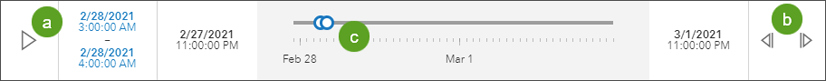 A time slider appears at the bottom of the map. Using the time slider you can (a) play or pause the animation, (b) adjust the time slider interval, (c) step forwards or backwards in time intervals, or (d) open Time slider options to adjust time settings to set the playback speed, time span, and time display.