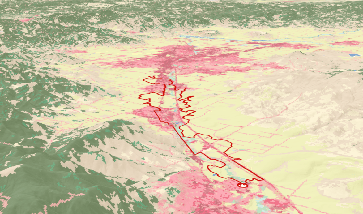 To help understand the landscape context of the fire I created a 3d map in ArcGIS Pro using the USA Land Cover layer to show the location of developed areas and forest lands. This map is available as a web scene.
