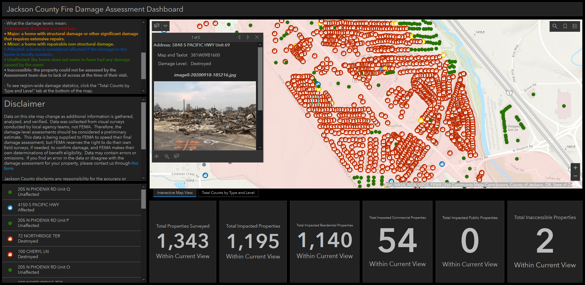Jackson County’s Damage Assessment Dashboard documents the extensive damage. Red symbols indicate buildings, mostly homes, that are a total loss.