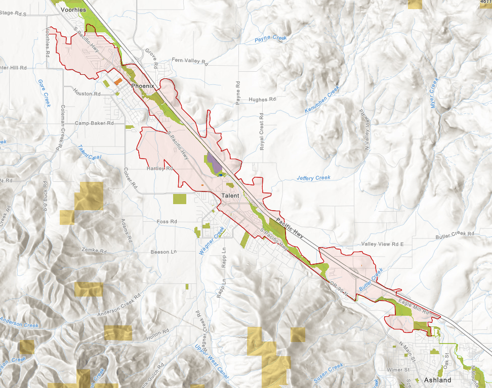 Interstate 5 crosses north out of California, over Siskiyou Summit, and descends into the southern end of the Rogue River Valley. Three small communities lie along the highway: Ashland in the south, home of Southern Oregon University is known for its Shakespeare Festival; Talent, with a pre-fire population of 6,000 tucked in the pear orchards; and Phoenix to the north, is the last small town before arriving in the big city of Medford and home to many working families and a large community of retirees.