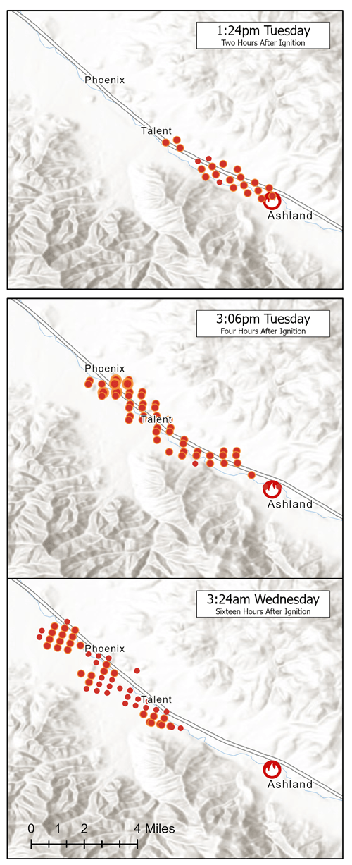 On September 8, 2020 a human caused fire started on the north end of Ashland, Oregon. Driven by winds over 40 mph, it left a 9-mile-long path of destruction burning over 2,800 structures and killing 3 people in just a few hours. Major portions of the cities of Talent and Phoenix were destroyed and thousands of people lost their homes and businesses.