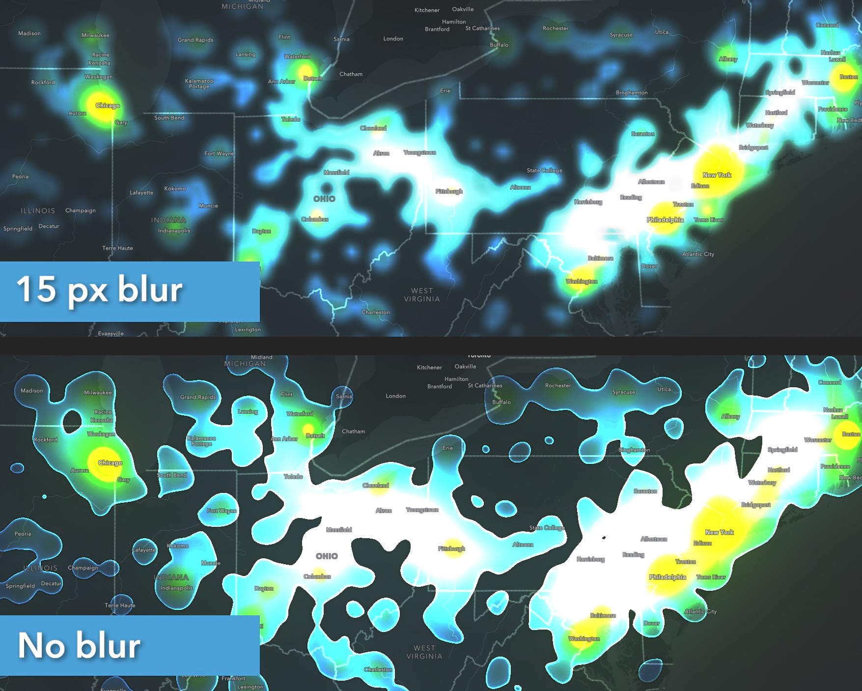 Blur and heat maps go together beautifully. Counterintuitively, I find adding a healthy amount of blur helps to clarify the map by smoothing out hard color breaks and feathering the edges of the shapes. You don’t have to use it, and sometimes hard boundaries will work better for you, but give it a spin. Fortunately blur is relatively immune to scale changes—unlike the bloom effect—so it’s a reliable choice for maps that will be viewed across a wide range of maps scales.