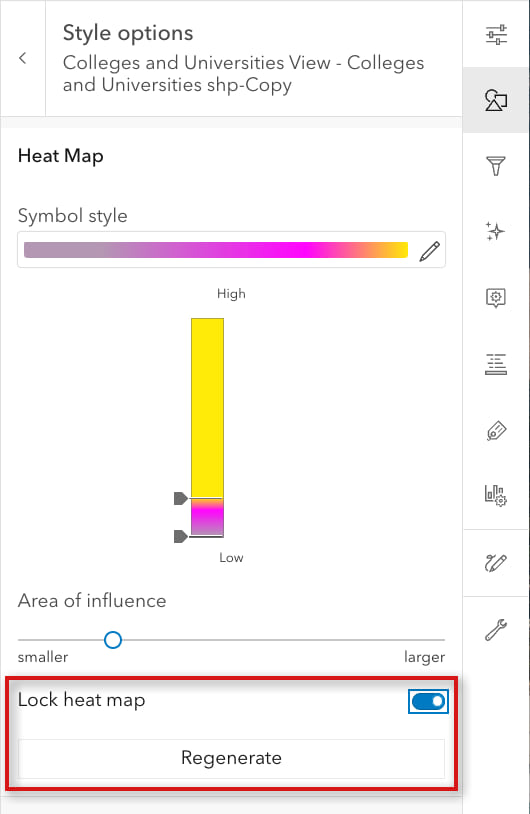 Now you have another choice: You can lock a heat map so that the density surface is generated at one zoom level and only that surface will be used for all the other zoom levels. In other words, the map will visually remain as you zoom in or out. If you don’t like the look of the heat map, go to a different zoom level and use the Regenerate button to re-calculate the surface. That will now become the locked view of the data. Word of warning: A heat map that looks great at one zoom level can be much too strong when you zoom out, so be sure to view your map across many zoom levels to see how it holds up before committing to this option.