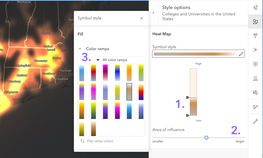 Word to the wise: The color gurus at Esri have designed heat map-specific color ramps for both light and dark basemaps, which are the only choices in the ramp selector. These special ramps have a distinct “hot” and “cold” end of the ramp which is required for this concept to work!