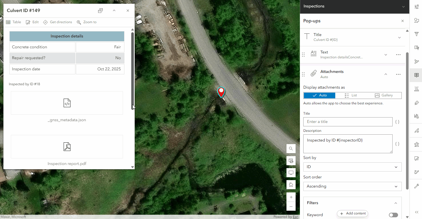 Feature attachments can play a key role in data validation, exploration, and presentation. These workflows are often aided by the pop-up. In these scenarios, viewers are shown all the attachments associated with a feature. One of the main pillars of creating great maps is only giving viewers the information they need. With all that in mind, we are excited to announce that with the October 2025 update of ArcGIS Online you will have control over which attachments are displayed in your pop-ups.
