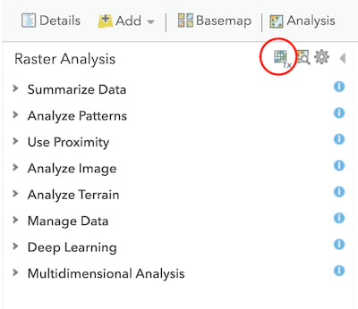 Select Raster Analysis. We need to convert our Scientific imagery layer to the supported Vector-MagDir source type. To do this, we need to create a new raster function by clicking on the Raster Function Editor button shown in the red circle below.