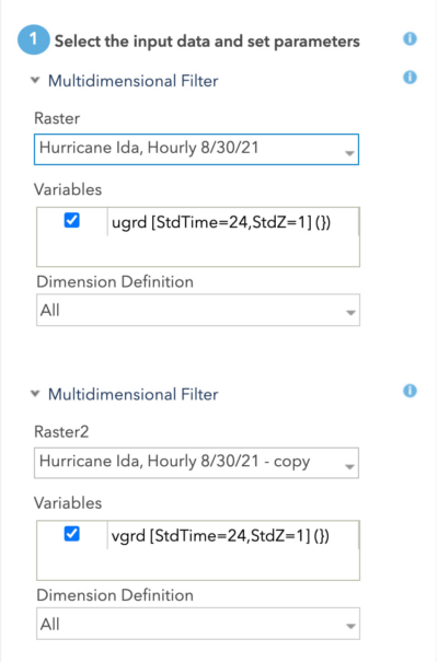 When selecting your input data, point one raster to your original layer and the second raster to your copied layer. This will allow you to select both your ugrd and vgrd variables. If using a dynamic imagery layer, you can use the same layer as your raster both times, but make sure to select a variable representing U or Magnitude for one, and V or Direction for the other.