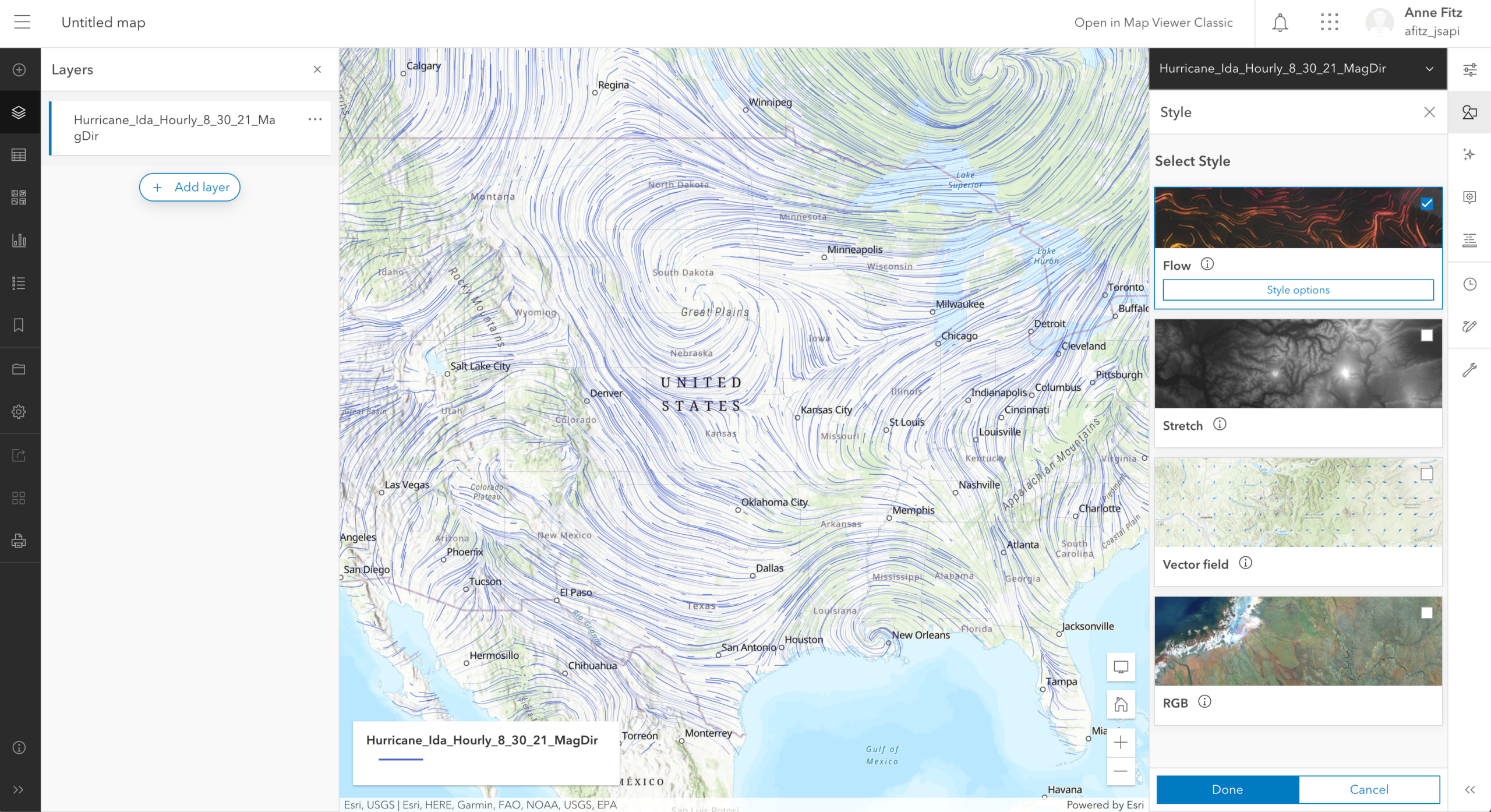 In the March release of Map Viewer and the ArcGIS API for JavaScript, we introduced an exciting new flow style to visualize magnitude and direction in imagery layers.