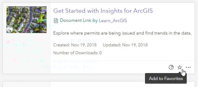 You can add Learn ArcGIS lessons to your Favorites by opening the item details, then click Add to Favorites.