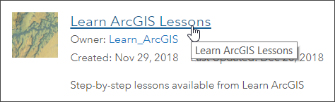 The Learn ArcGIS Lessons group should now be at the top of your search. You can verify that by looking for Owner: Learn_ArcGIS. Click the title to open the group’s contents.