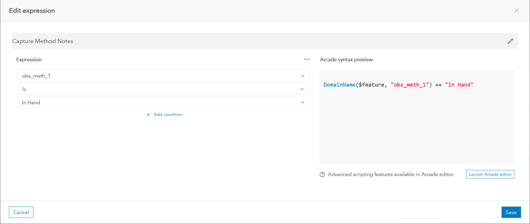 Note: To create a more advanced expression, launch the Arcade editor in the lower right corner to start scripting.