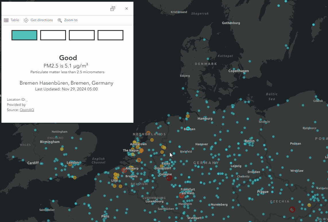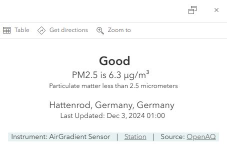 In this example, an air quality gauge is built using flexbox. The gauge reinforces the other pop-up content and the layer style.