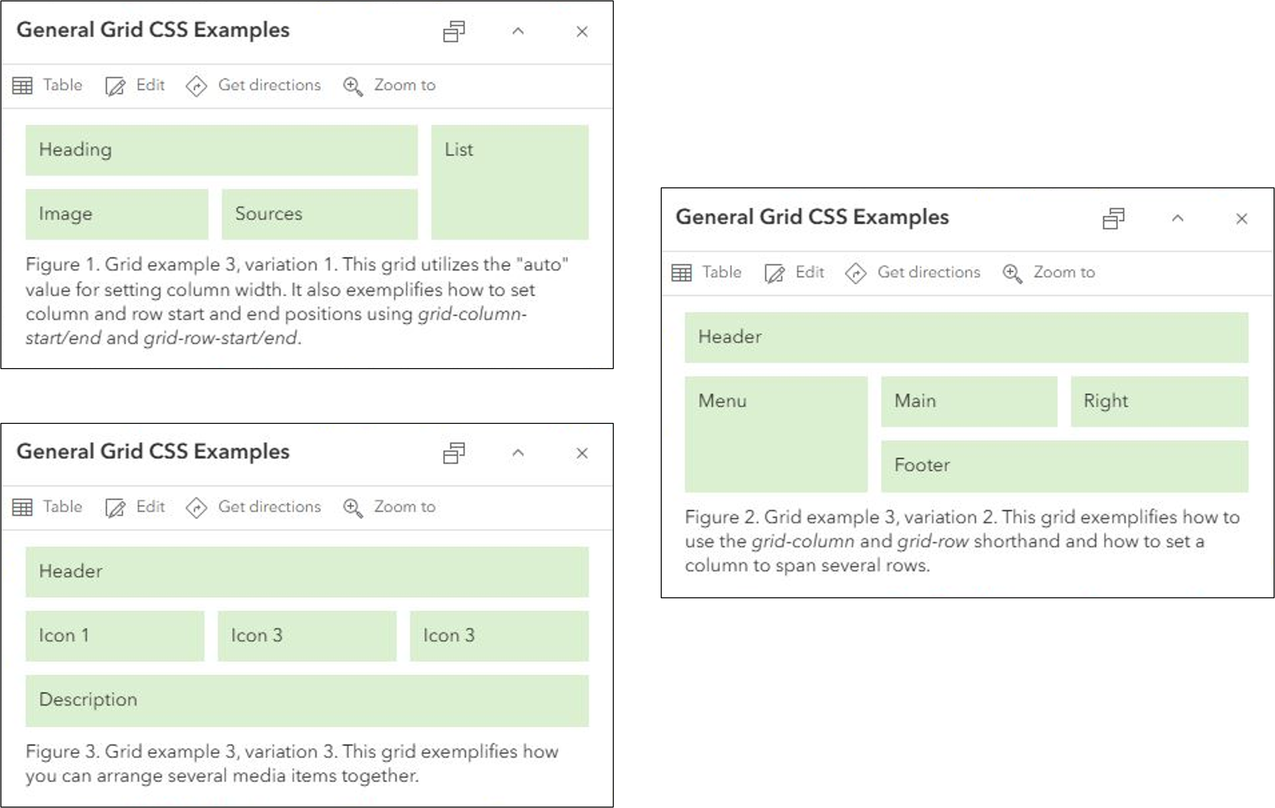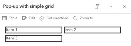 The following images show a variety of grid layouts within the pop-up. Each grid has been constructed in a generic way to help you visualize your content within the layout. The code is also general, to streamline adding it to your maps.