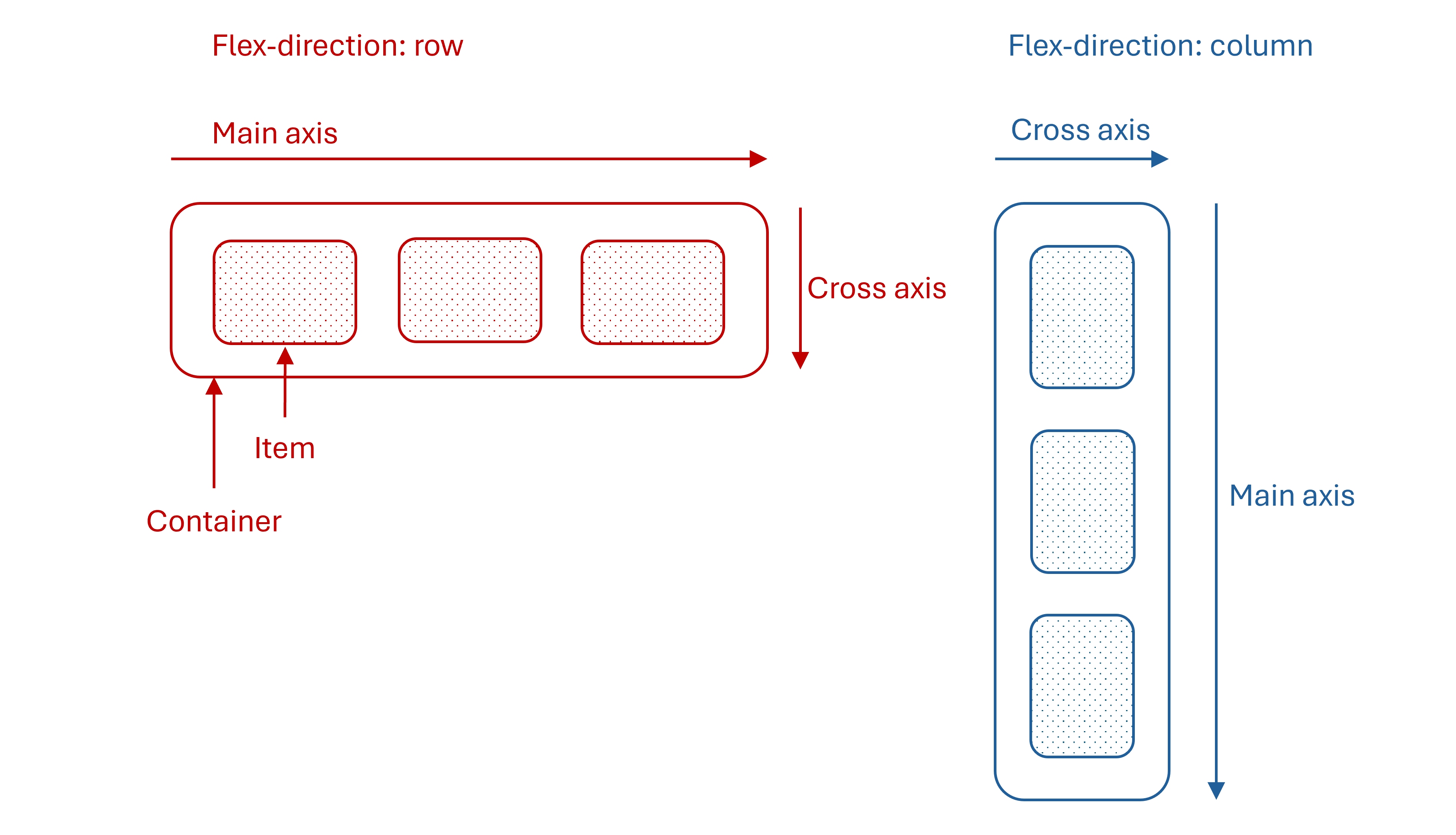 Flexbox is a one-dimensional layout system. By one-dimensional, I mean that you can create either a column or row layout. In the diagram below, you’ll see a container with items inside. A flexbox container is defined by setting the display property to flex. The content within a flex container become flex items. The orientation of the flex items is determined by the flex-direction property, which can either be column or row. An important concept relating to flex direction are axes. There are two axes, a main axis and a cross axis. For example, when the flex direction is set to column, the main axis is vertical, and the cross axis is horizontal. Axes are important to consider when setting the alignment of your content.