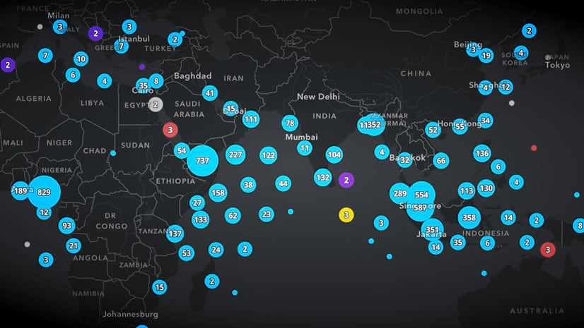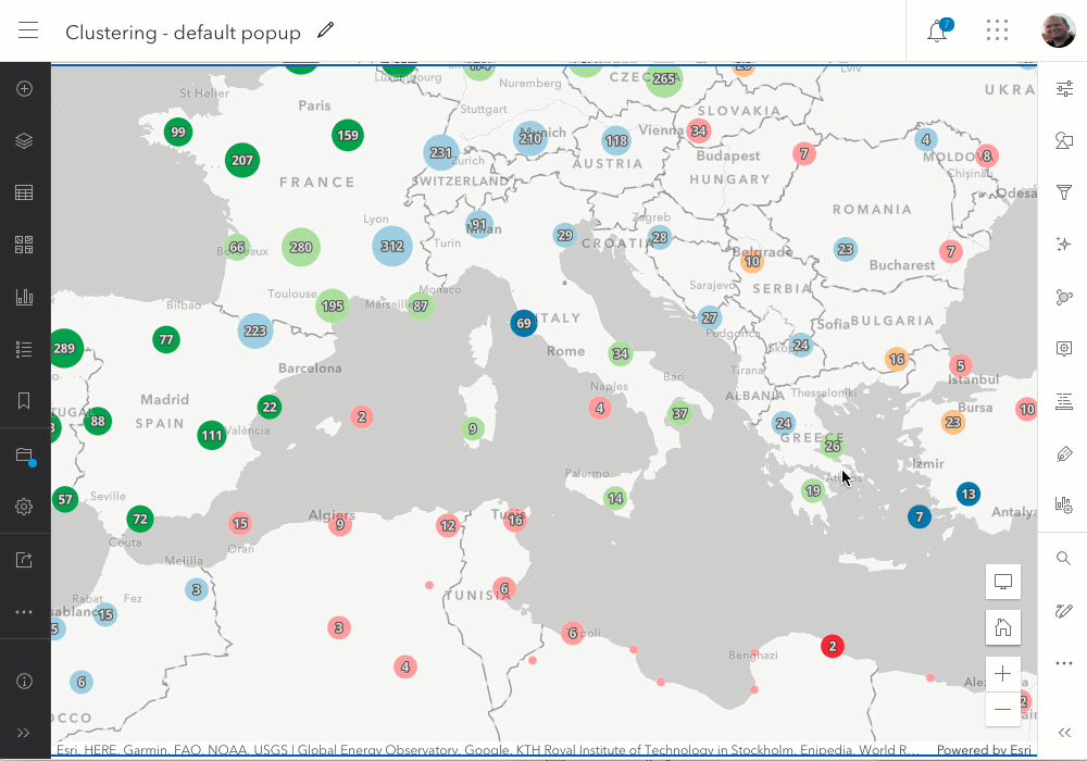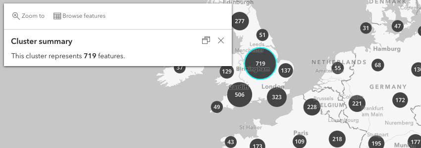 Clustering is a method of merging nearby and overlapping features into a single symbol to declutter the view. The size of the cluster icon indicates the number of features in each cluster relative to other clusters.