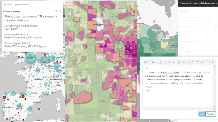 - Access a cluster’s features within an Arcade expression for cluster popups. Now you can iterate through a cluster’s features in an Arcade expression to create lists, tables, and charts summarizing the cluster. The remainder of this post will demonstrate various ways you can do this.