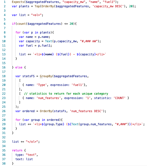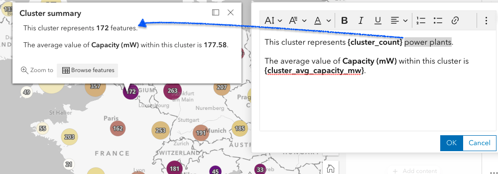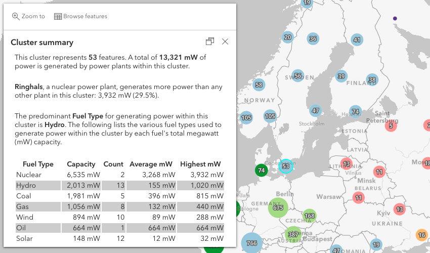 By default, the cluster popup only displays the average of numeric attributes included in the layer’s style. However, it may be more appropriate to display the sum of numeric attributes. The following example demonstrates how to calculate the total mW capacity of all power plants in the cluster using Arcade.