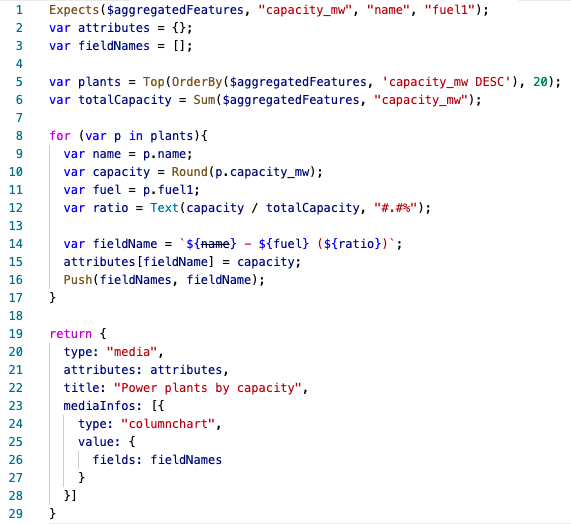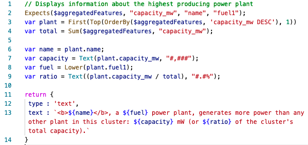 You may want to display information about the power plant that produces the most power within the cluster. The expression can return its name, capacity, and the type of fuel it uses to generate power. These are multiple bits of information that can be returned as a text element directly from the expression.