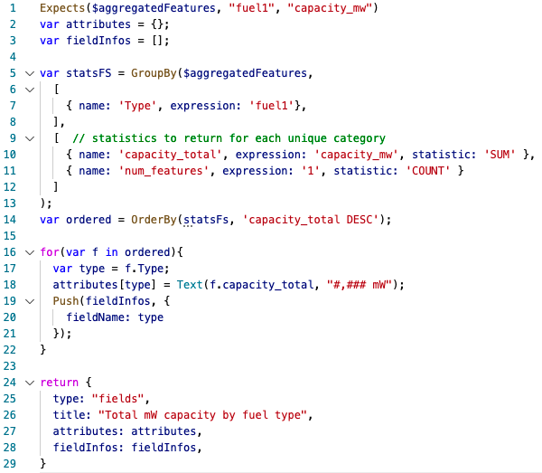 Similarly, you can return an attribute table directly from an Arcade expression. The following snippet does this to list the distinct types within the cluster. Rather than report the count for each fuel type, it reports the total capacity for each fuel type. It’s interesting to observe how different the list looks when comparing total count vs. total capacity.