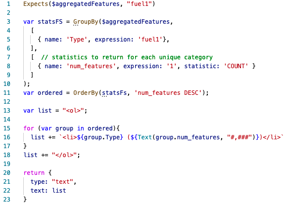 Because expressions can return popup content elements, you can return HTML from an expression to display in the popup within a rich text element. The following expression finds the distinct types within the cluster, iterates through each to get the count of each category, and dynamically builds an ordered list as HTML to return in the popup text element.
