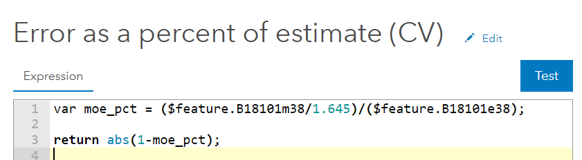 The expression dialogue box appears for us to name and type in our expression. We want to create an expression that shows the range as a percent of the estimate. This video (6 min.) on Census’ documentation pages walks through different ways to do this. We can then subtract it from 1 so that the smallest MOE percentages will appear darker (less transparent) :