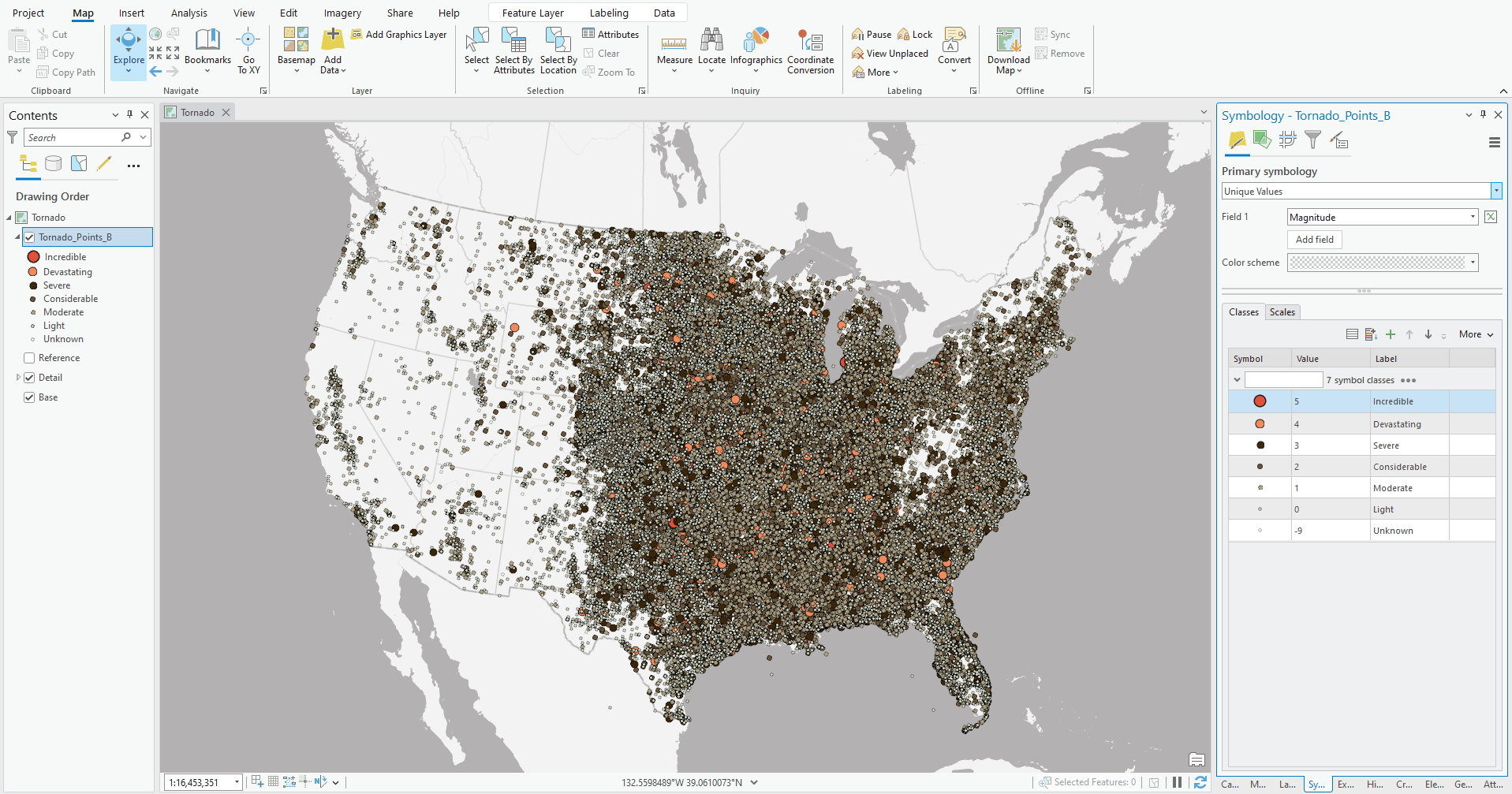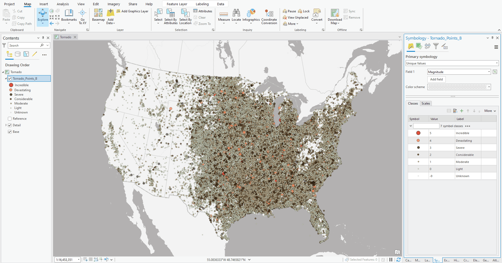 The last thing we want is to show the most significant tornadoes on the top which is accomplished with Feature Display Order when you are in the Symbology tab. By switching it to magnitude this map now reveals a clear story showing states like Iowa, Illinois, Kansas, Oklahoma, Mississippi, and Alabama all having more frequent and significant tornado events.