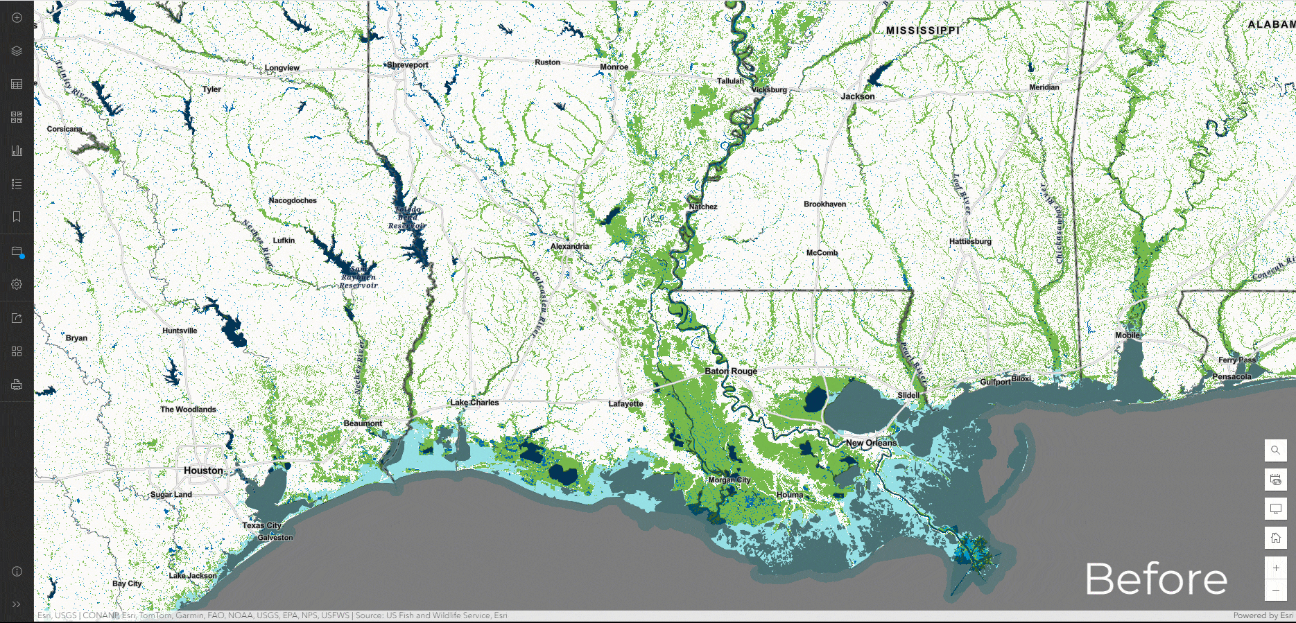 Once saved, you can add in the new Human Geography Detail layer from My Content to a webmap, like this one. Notice the gray lakes and ocean make a suitable neutral background to highlight the wetlands layer.