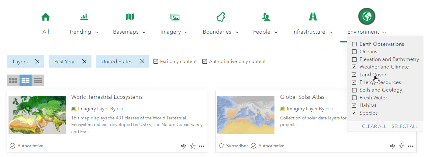 The Browse tab at the ArcGIS Living Atlas website provides comprehensive search and filtering tools to help find maps, apps, layers, and tools for your projects. Favorite what you find to make it easy to leverage Living Atlas content, without needing to go back and browse again.