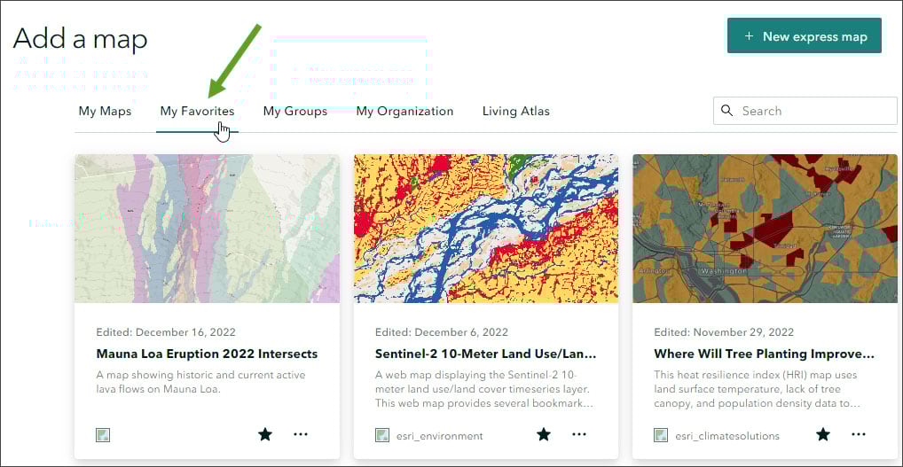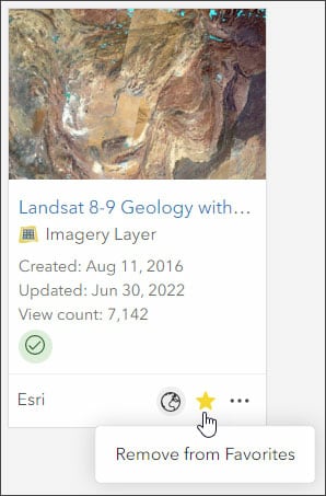 You can also favorite items you find via the Living Atlas website after you sign in to your account. Browse for Living Atlas content, then just like above, click the star to add the Living Atlas item to your favorites.