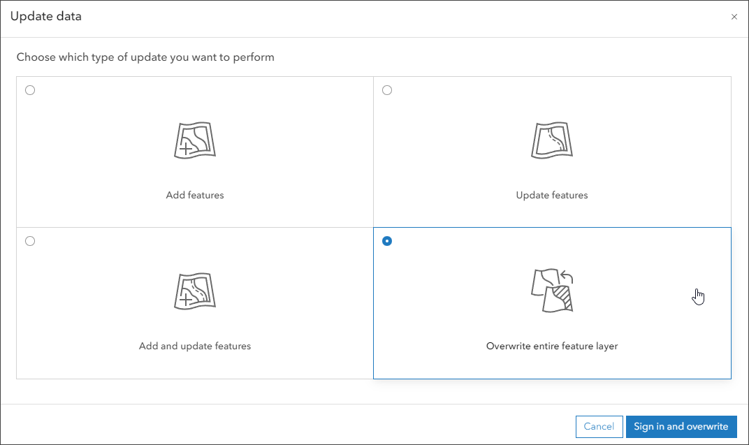 Step 2 — Choose Overwrite entire feature layer, then click Sign in and overwrite.
