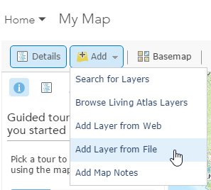 To add the GPX file to a web map, choose Add, then Add Layer from File: