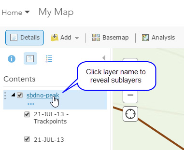 Once imported, your GPX will display on the map. But depending on what you captured using your GPS device and exported to the GPX file, you may have sublayers you can toggle on.