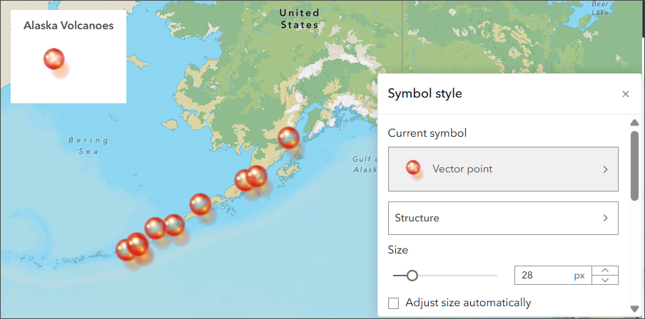 Step 3 — Open the Layers pane from the Contents (dark) toolbar. Ensure that the Alaska Volcanoes layer is selected.