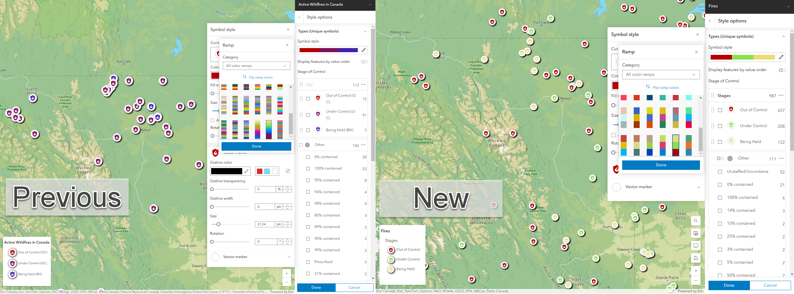 A small but impactful update to styling is that ramp color styling will distribute distinct colors when working with a smaller amount of values. Previously, similar color values would have been automatically applied despite only having a few types. Now, distinct colors are applied to help with map readability.