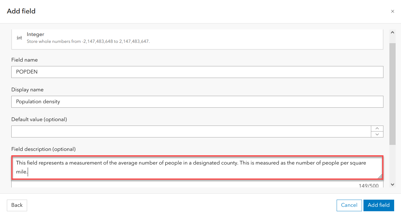 Adding and deleting fields within Map Viewer was introduced in the June 2024 update of Map Viewer. Now, you can add a field description when creating new fields for your hosted feature layer.