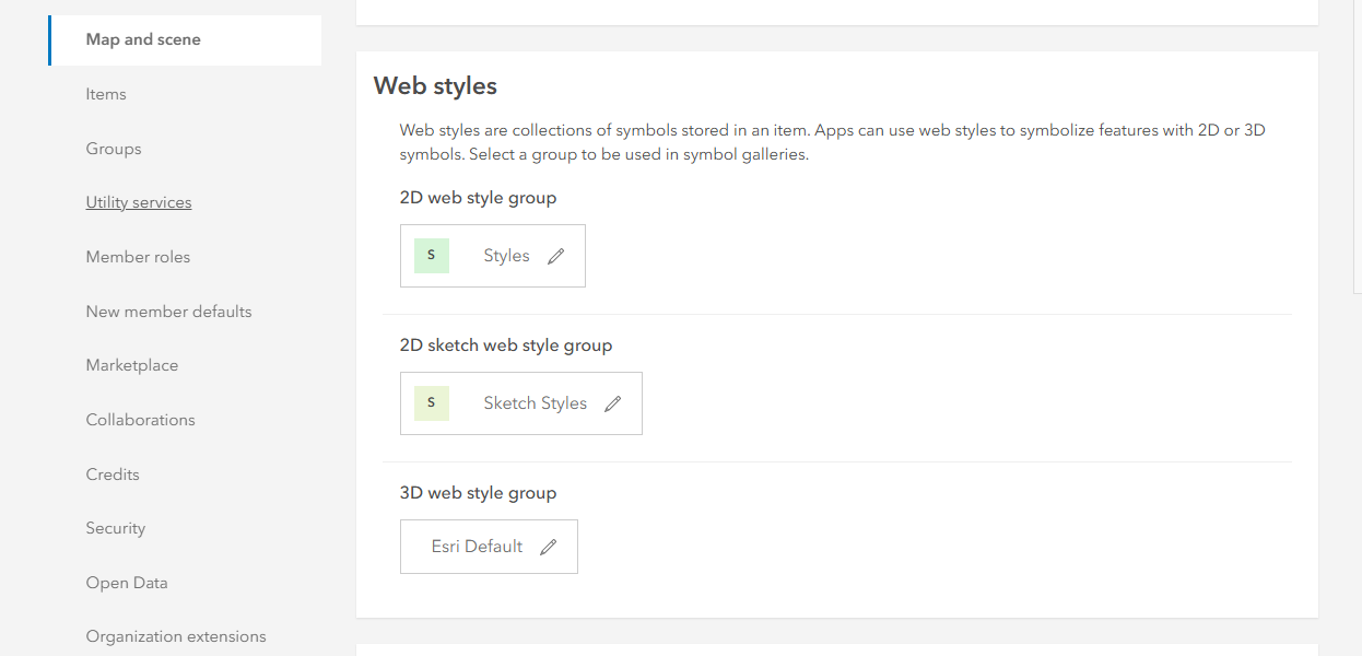 Web styles are collections of symbols stored in an item and are used to symbolize features. You can now customize your sketch symbol gallery by specifying a 2D sketch web style group in the Organization settings.