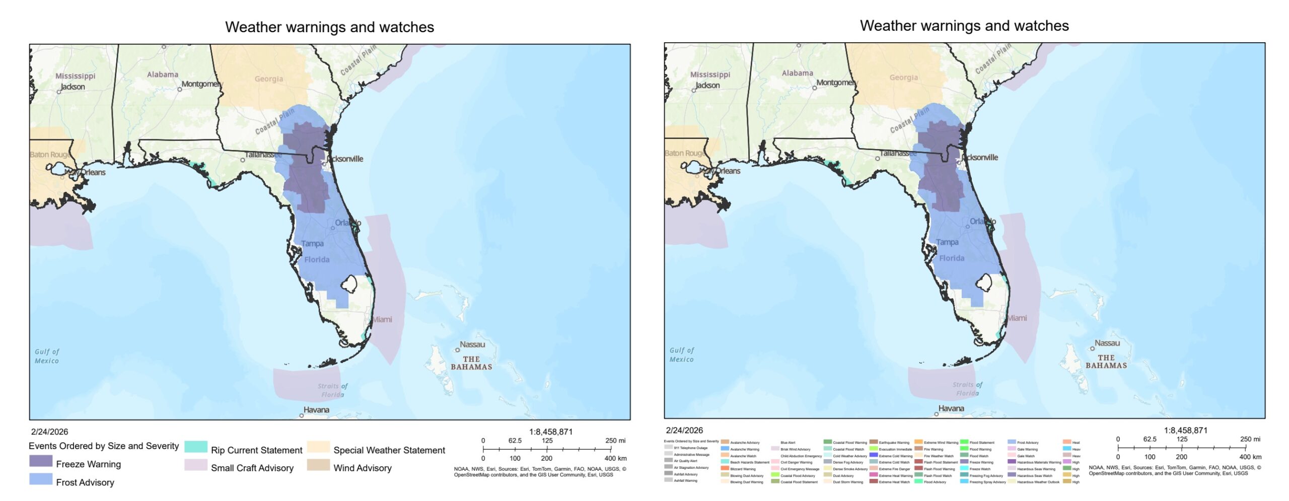 For a web map like the one above, a legend that shows all of these categories makes sense because the data is updated throughout the day and users can pan around to different regions on the map that may be experiencing different weather. When creating a static print export of the same web map, it may not make sense to include all these legend values because you are only printing one region at one moment in time. The images below are print exports of a specific region of the same web map and illustrate the benefit a dynamic legend (left image) has in this case. It brings focus to the warnings relevant to the printed area and improves the overall readability of the legend.